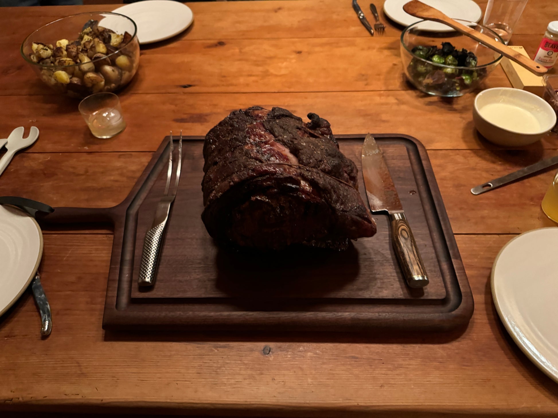Designed for serious cooking and effortless serving, this large carving board is handcrafted in our New York studio from solid American hardwoods. Its generous surface and continuous juice groove are purpose-built for carving roasts, resting meats, slicing vegetables, and catching juices without mess — making it a kitchen essential for everyday use and holiday cooking alike.