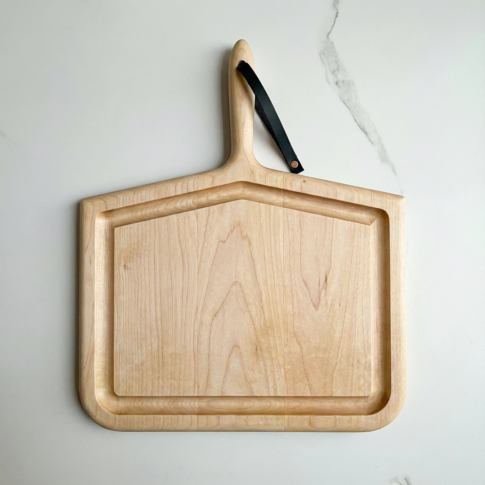 The sculpted silhouette features softly rounded edges and a tapered handle, fitted with a removable leather strap for easy hanging and storage. Thoughtful proportions allow the board to transition seamlessly from prep to presentation, whether you’re carving a roast at the table or building a composed spread for guests.